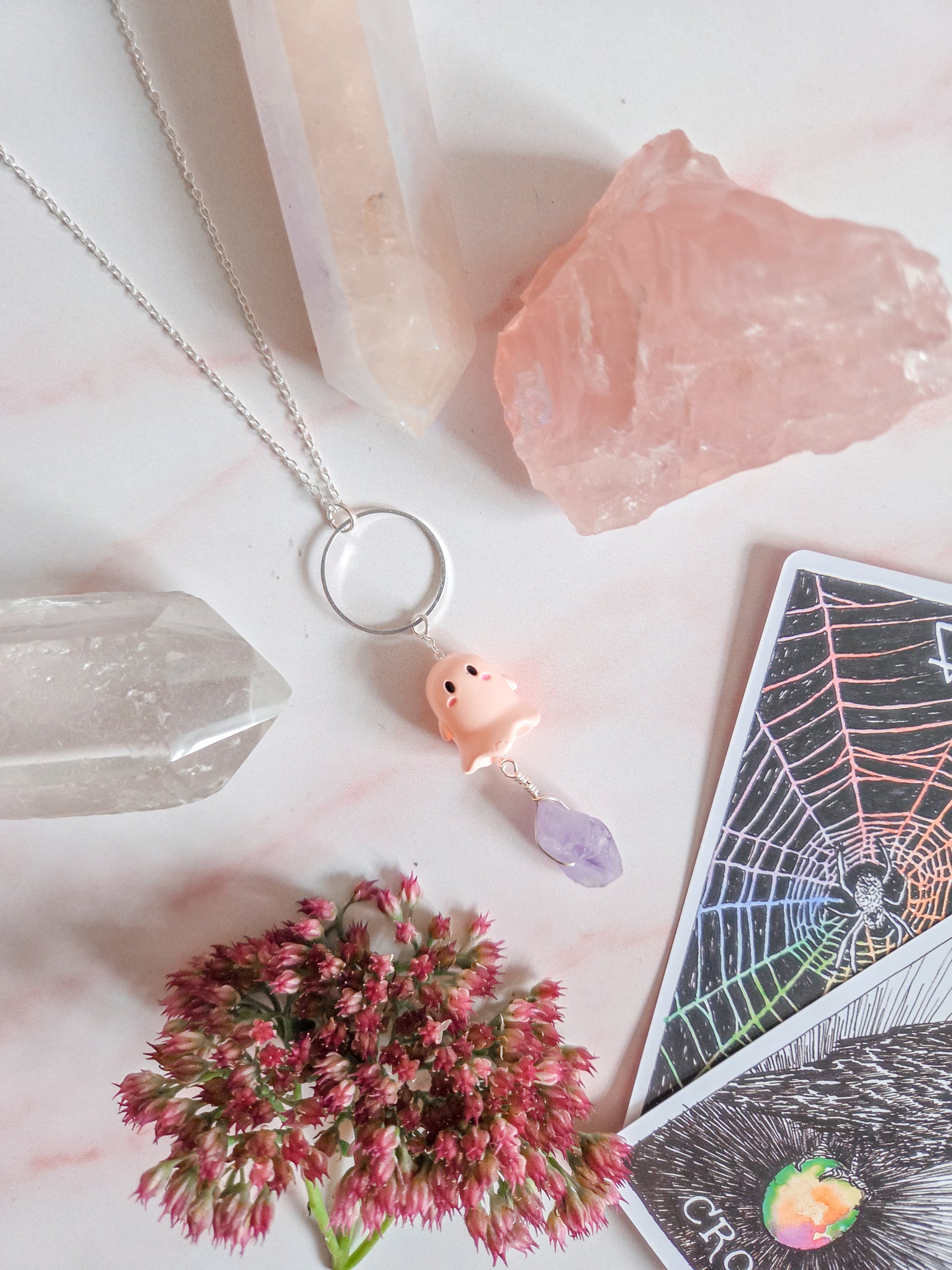 Say boo to boring jewellery 👻✨ This adorable ghost necklace brings a playful twist to spooky season style! Featuring a sweet pastel ghost charm and a dreamy amethyst crystal drop, it’s perfect for adding a touch of magic (and mischief) to your outfit. Cute, quirky, and just a little bit haunted — what’s not to love? 💜