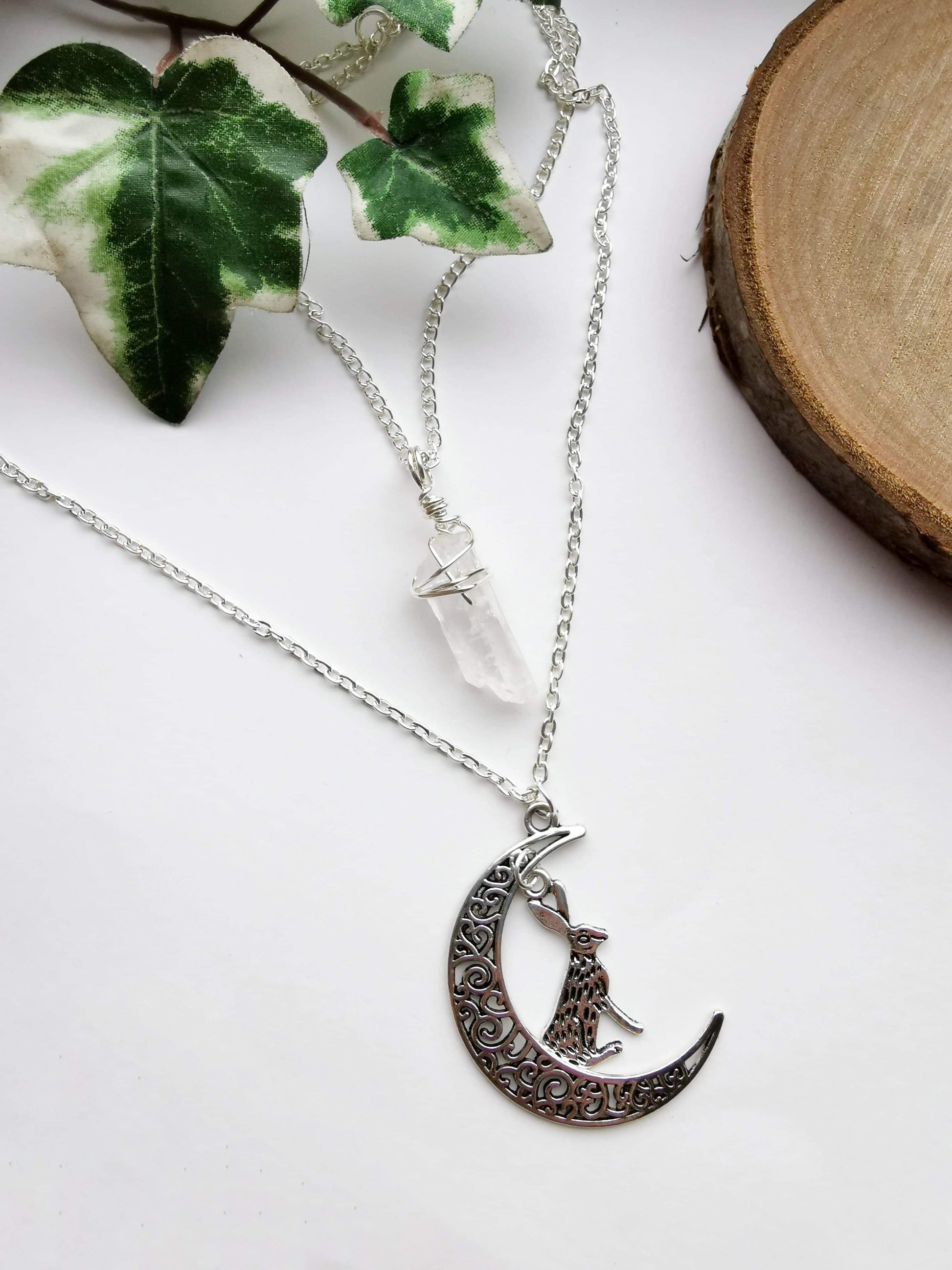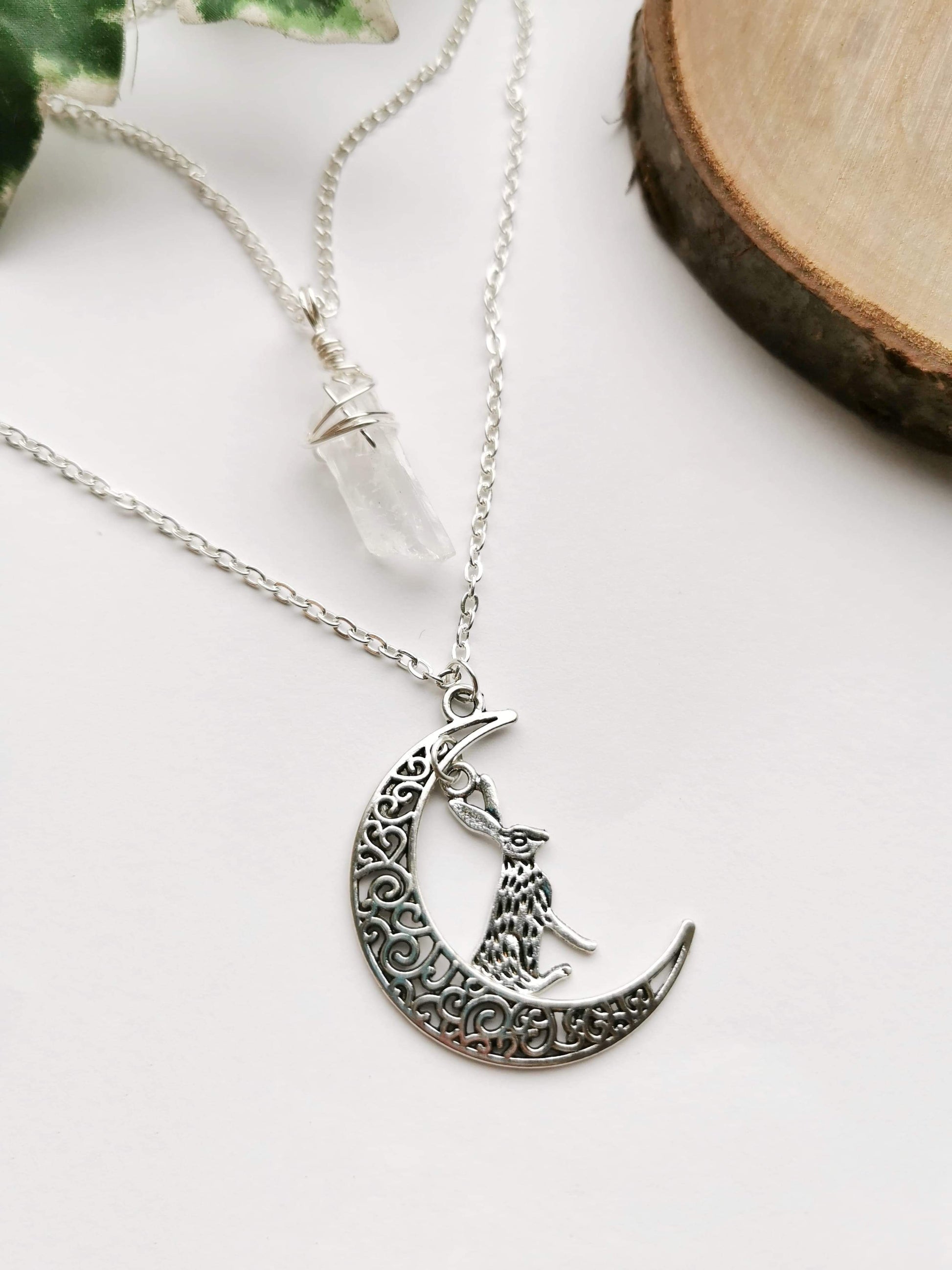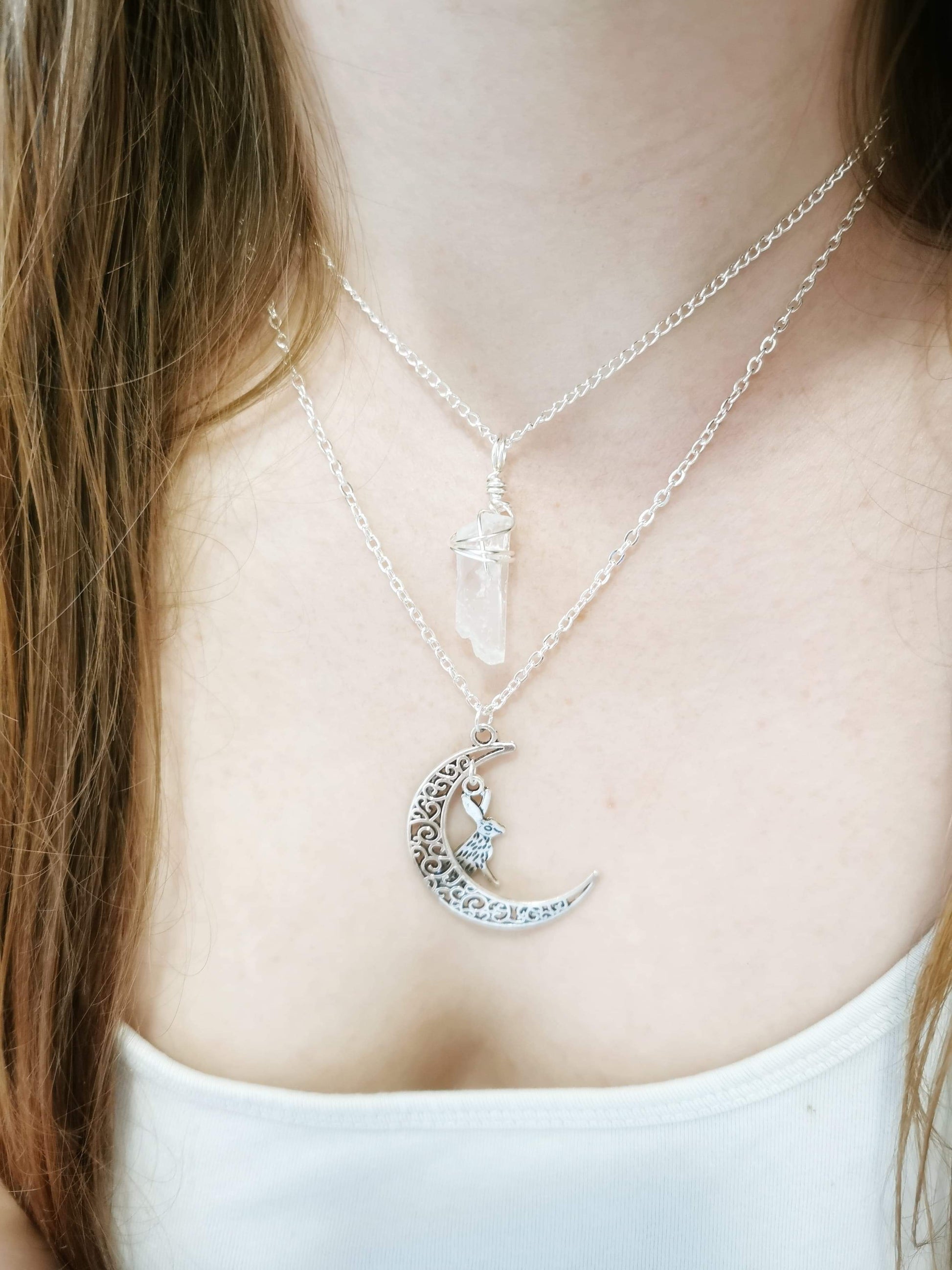 Brand new for Willow Rose Designs - the highly fashionable layered necklace! We have taken the concept and added our own style. The moon gazing hair sits nestled in an ornate crescent moon on the lower layer of the necklace, while a clear quartz crystal hangs like a shaft of moonshine above. The two necklaces are worn as one, and the effect is spectacular.