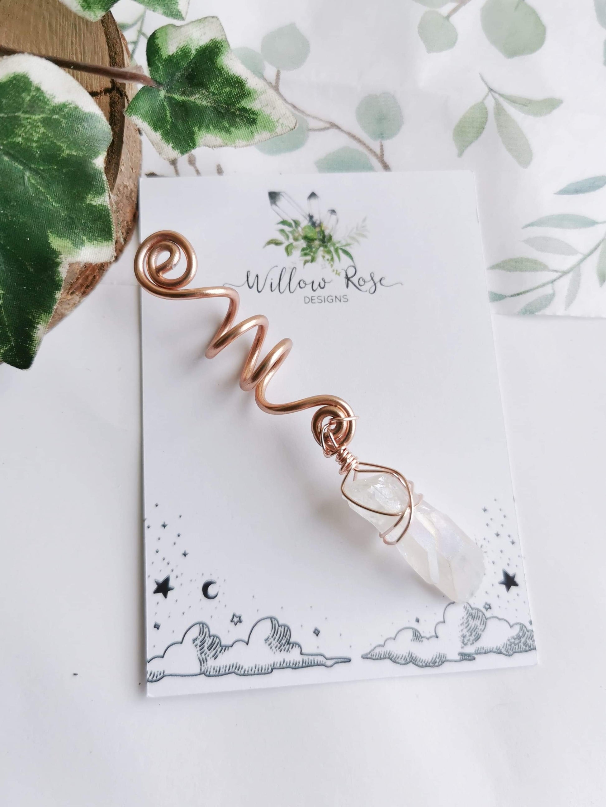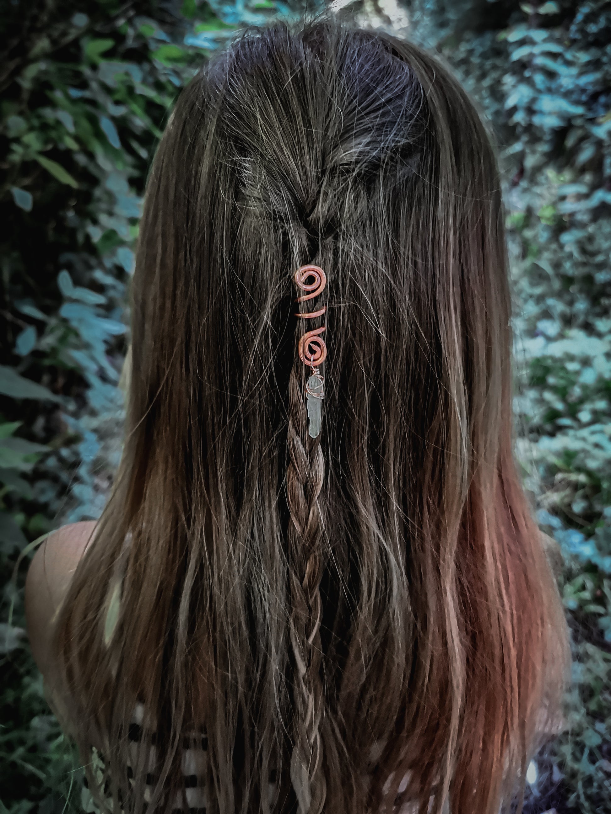 These hair braid cuffs are made from copper coloured, lightweight aluminium. Choose your finish: either as a plain spiral, or with a wire wrapped clear quartz crystal.